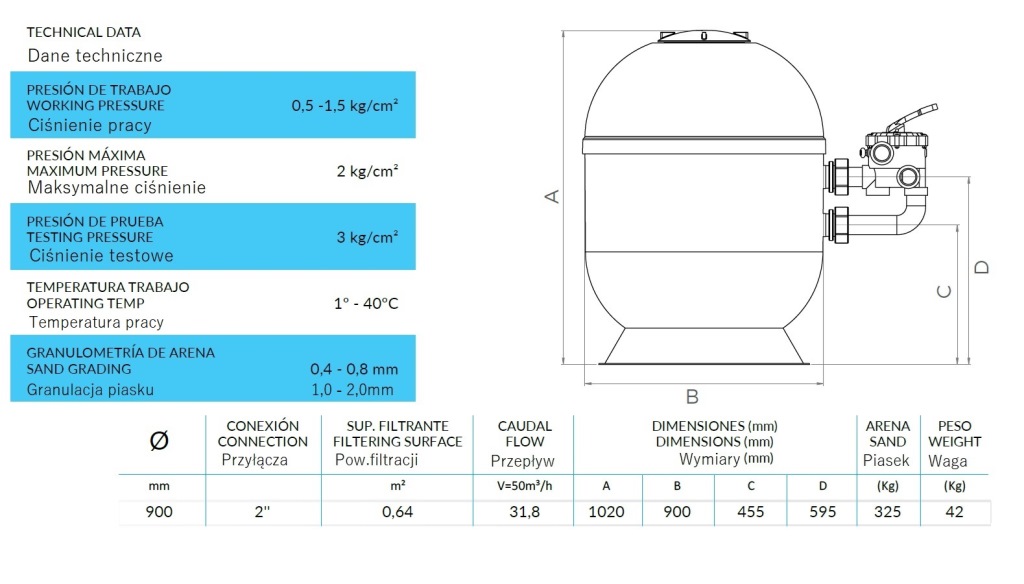 Filtr basenowy nadaje również się do wody z elektrolizą soli .Maksymalne chwilowe ciśnienie 2 bar .Wymiana złoża piasku co 2 lata ,zaś złoża AFM co 10lat.
