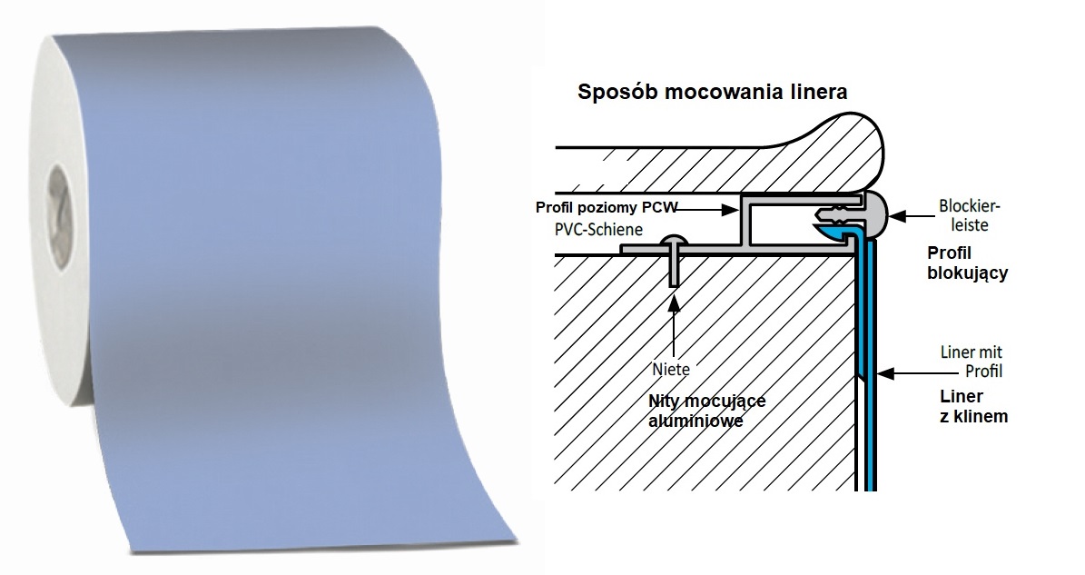 Istnieją dwa sposoby zawieszania linera ,na klin i wywijając folię ,a następnie dociskając go listwą.
