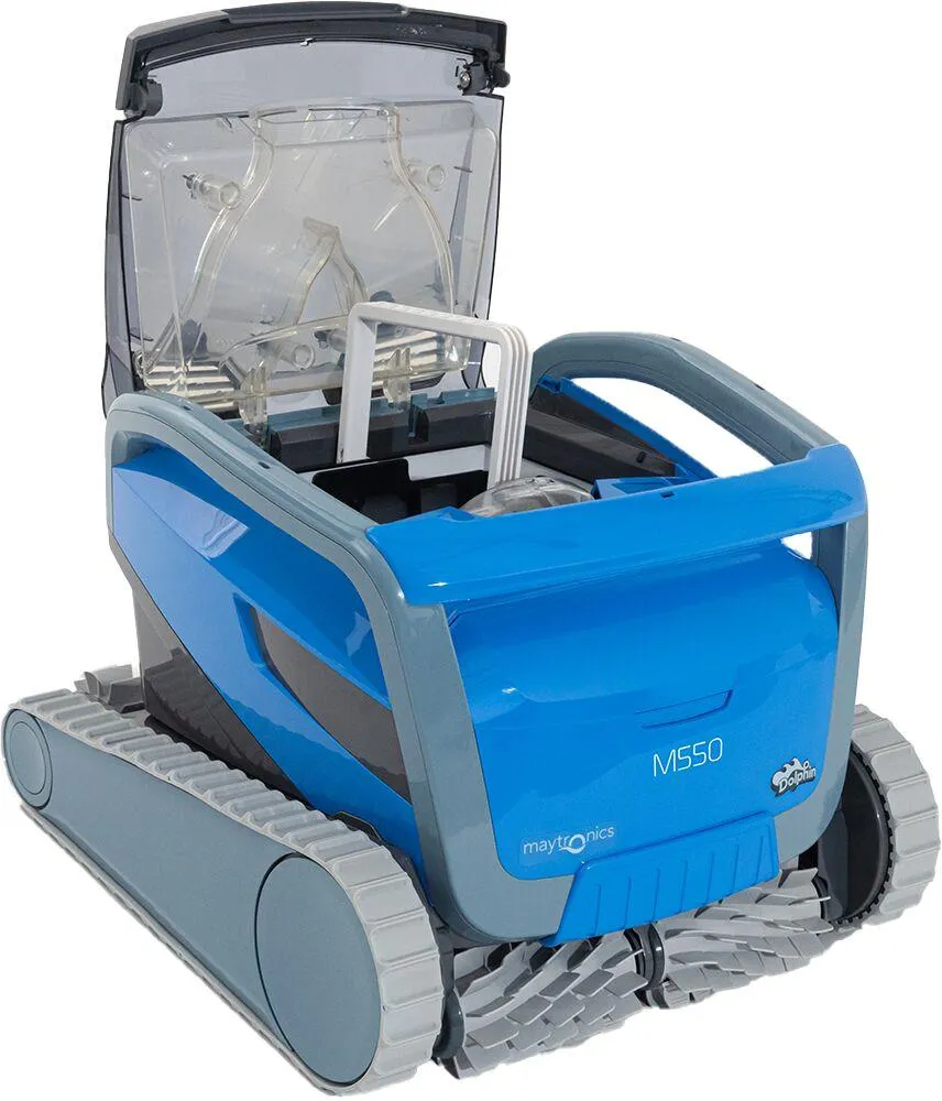 Odkurzacz basenowy Dolphin M550 posiada dwie szczotki czyszczące ,oraz filtr 50mikronów.Robot posiada także aplikację z możliwością połączenia się przez Bluetooth i WiFi ,system przywoływania do brzegu oraz praktyczny wózek w komplecie.
